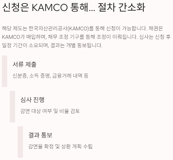 해당 제도는 한국자산관리공사(KAMCO)를 통해 신청이 가능합니다.