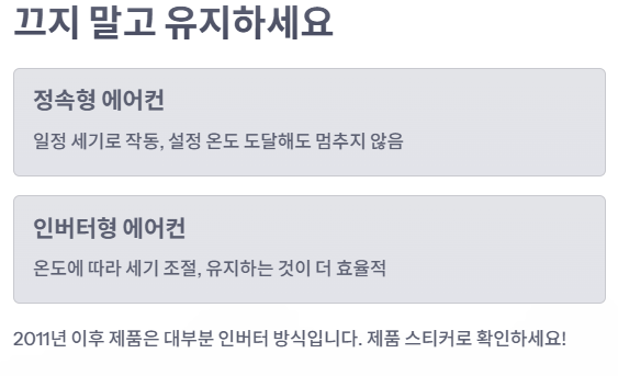 - 정속형 에어컨: 일정한 세기로 작동하며, 설정 온도에 도달해도 멈추지 않기 때문에 전기 소모가 많습니다. 이런 경우에는 껐다 켰다를 병행하는 것이 적절합니다.