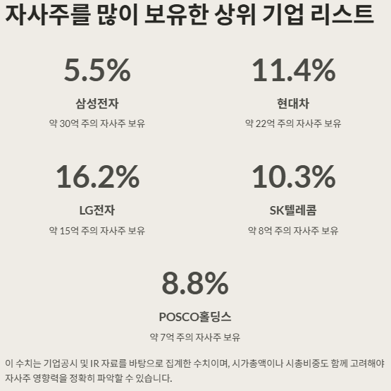 이 수치는 기업공시 및 IR 자료를 바탕으로 집계한 수치이며, 시가총액이나 시총비중도 함께 고려해야 자사주 영향력을 정확히 파악할 수 있습니다.