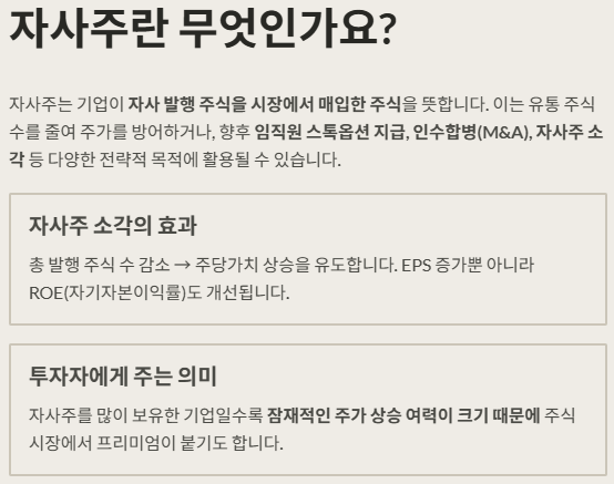 자사주는 기업이 자사 발행 주식을 시장에서 매입한 주식을 뜻합니다. 이는 유통 주식 수를 줄여 주가를 방어하거나, 향후 임직원 스톡옵션 지급, 인수합병(M&A), 자사주 소각 등 다양한 전략적 목적에 활용될 수 있습니다.