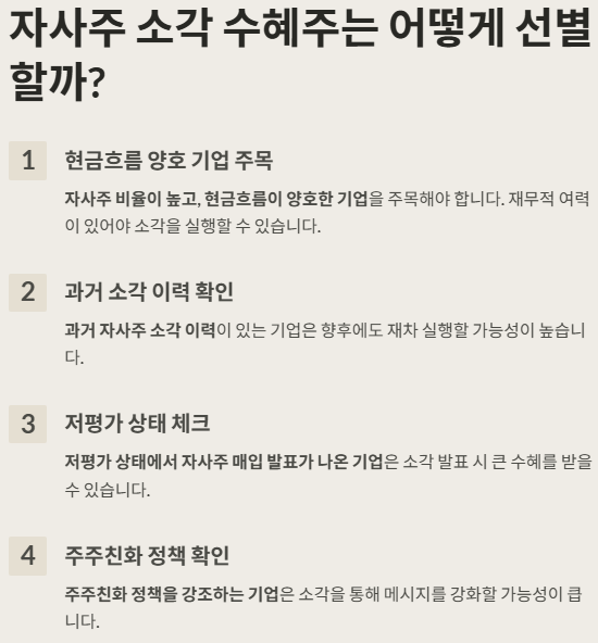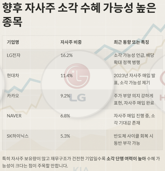 특히 자사주 보유량이 많고 재무구조가 건전한 기업일수록 소각 단행 여력이 높아 수혜 가능성이 크다는 점이 주목할 만합니다.