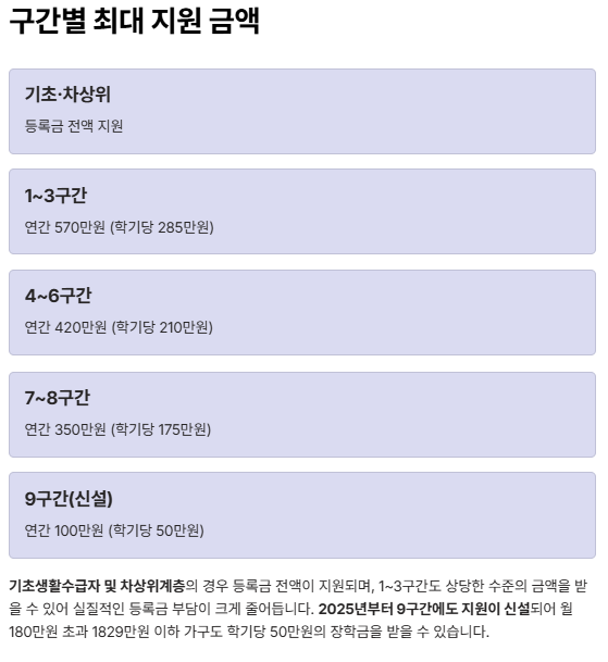 특히 주목할 점은 2025년부터 9구간에도 지원이 신설되었다는 점입니다. 이전까지는 소득 8구간까지만 지원되었지만, 이제는 월 180만 원 초과 1829만 원 이하 가구도 학기당 50만 원의 장학금을 받을 수 있습니다.