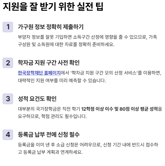 - 등록금을 이미 낸 후 소급 신청은 어려우므로, 신청 기간 내에 반드시 접수하고 등록금 납부 계획과 연계하세요.