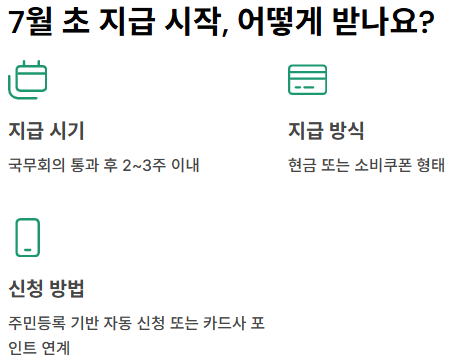 실제 지급 시기는 국무회의 통과 후 약 2~3주 이내가 유력합니다. 정부는 빠르면 7월 초부터 현금 또는 소비쿠폰 형태로 지급이 가능하도록 행정 시스템을 사전에 정비 중입니다. 지급 방식은 주민등록 기반 자동 신청 또는 카드사 포인트 연계 방식이 검토되고 있습니다.
