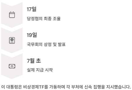 정부와 여당은 17일 당정협의를 통해 지원금 지급 방식에 대한 최종 조율에 나섭니다. 이후 19일 국무회의에서 2차 추경안과 함께 공식 발표될 예정입니다. 이 대통령은 빠른 시일 내에 실제 지급이 이뤄질 수 있도록 비상경제TF를 가동하며 각 부처에 신속 집행을 지시한 상태입니다.
